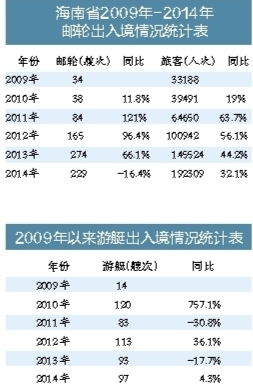在邮轮方面,一是2011年12月16日,国家旅游局下发了《国家旅游局关于批准开通三亚至越南海上邮轮边境游线路的复函》,同意开通三亚至越南的岘港、广宁(下龙)海上邮轮边境7日游线路。海口至越南海防、下龙湾海上邮轮边境5日游线路。二是国家同意海南实施西沙旅游开放开发的政策。2013年4月28日,西沙邮轮旅游成功通航,航线为海口—北礁—西沙永乐群岛,2014年9月开始改为从三亚出发。主要参观永乐群岛的全富岛、鸭公岛和银屿。截止2015年5月共运行59航次,接待游客9575人次,目前西沙邮轮旅游实现了常态化运营。三是2013年10月30日,公安部、国家旅游局《关于同意海南省海口市和三亚市开展边境旅游异地办证工作的通知》,同意海口市、三亚市开展边境旅游异地办证工作,三亚市和海口市分别于2013年12月和2014年1月正式开通了边境旅游异地办证邮轮游线路。