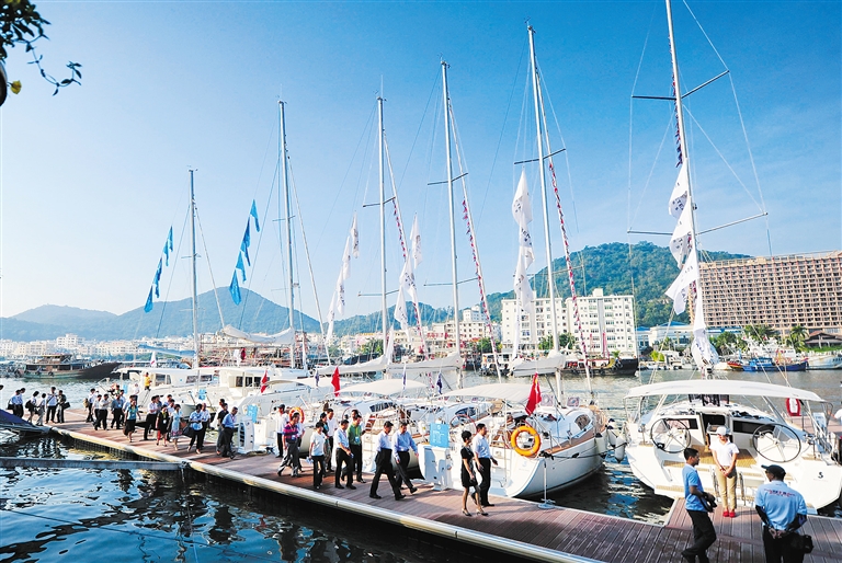 10月16日上午,参加2015海南国际旅游岛邮轮游艇产业发展大会的代表嘉宾在三亚参观游艇。本报记者 武威 摄