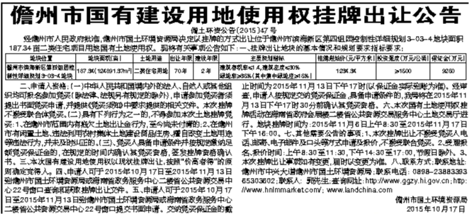 儋州市国有建设用地使用权挂牌出让公告