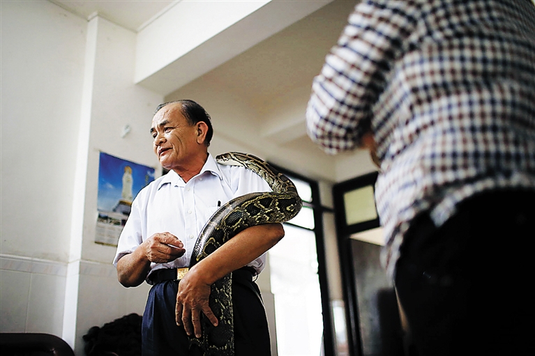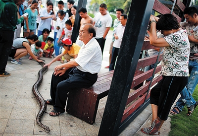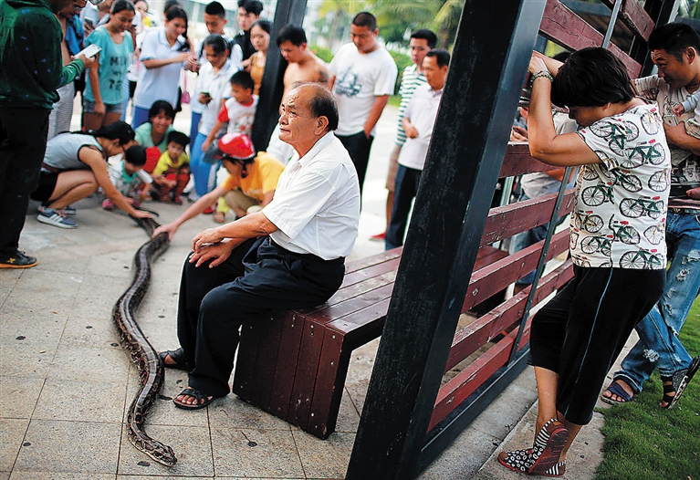 在海口,民伯与他的“南王”相处了7年,有着特殊的感情。“南王”是一条长达3.6米重达100多斤的大蟒蛇,每次上街,它的身影,总会引来路人的一阵惊呼。