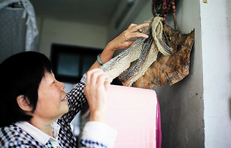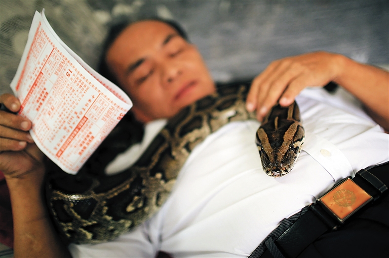 平日里,民伯躺床上“研究”彩票号码时,“南王”会温顺地蜷绕在他身上,时松,时紧。“听话,往上一点,好,就这里,使劲一点……”这是民伯在让“南王”给他做“按摩”。大蟒蛇通过它独特的方式,在帮助民伯放松筋骨,而民伯这样独特的“享受”,已经成为他与“南王”之间的常态。偶尔,左邻右舍或亲朋好友们,也会过来享受“南王”提供的这种独特“服务”,慢慢地,大家也都很喜欢与“南王”相处。