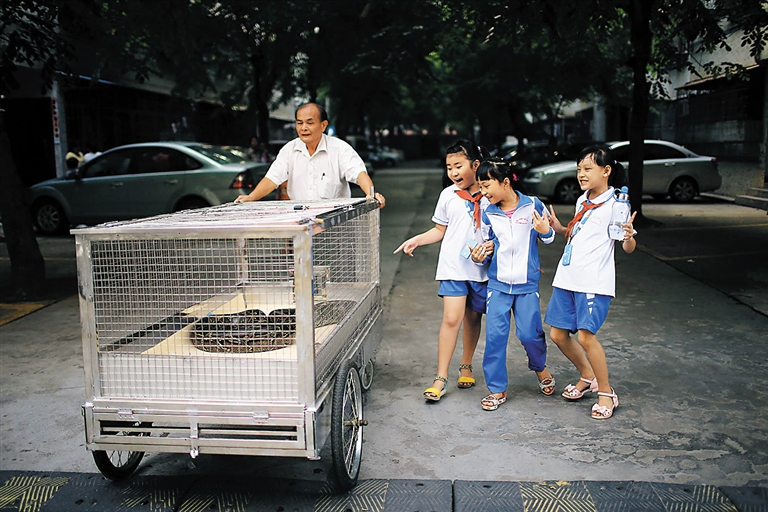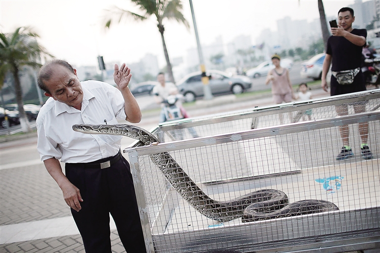 10月15日,马上就到大蟒蛇“南王”长达半年多的冬眠时间了,冬眠前,民伯将“南王”放在特制的大笼车里,推上街,到南渡江畔散散步。民伯与他的“南王”出现在街头,总是引起路人的注目与惊呼,纷纷驻足拍照。好奇心重的,还会跟着一路同行,边走边拍,向朋友们“微信直播”这样的奇遇。