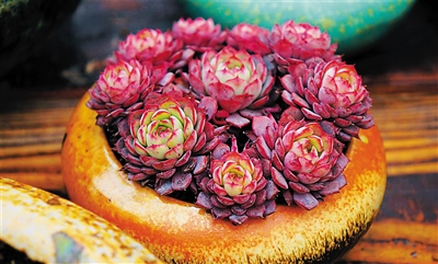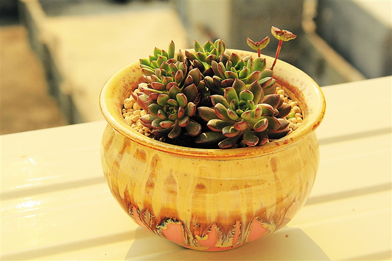 根据不同多肉植物的外形和颜色,克拉分别配上了土盆、陶盆等各式各样的小盆。他表示,“发挥创意,将形态各异的肉肉配上造型各异的花盘,令人赏心悦目、意趣盎然。”