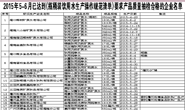 2015年8月,省食药监局对全省桶装饮用水生产企业落实《清单》情况进行督查,发现仍有少数企业不符合要求,已责令这些企业限期整改。经过持续整治,我省桶装饮用水抽检不合格率已大幅度降低。为了做到市场上销售的桶装饮用水100%合格,维护消费者身体健康,特公告如下: