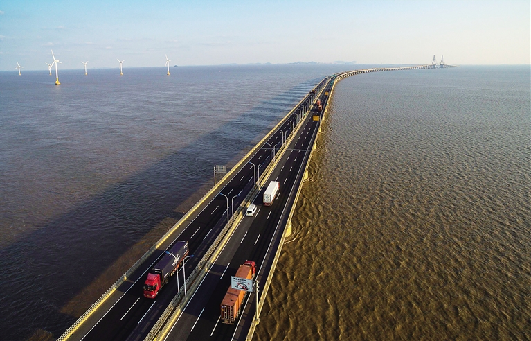 这是10月16日航拍的上海国际航运中心连接浦东和洋山岛的跨海大桥——东海大桥。 近年来,上海全力打造建设国际航运中心新坐标——洋山深水港区,增强上海服务长江流域、连接世界和通达全球的能力。目前,上海港集装箱吞吐量已连续五年位居全球第一,国内首个全自动化集装箱码头已在上海国际航运中心洋山深水港区开工建设,到2017年建成时,年吞吐量将突破4000万标准箱。 新华社发
