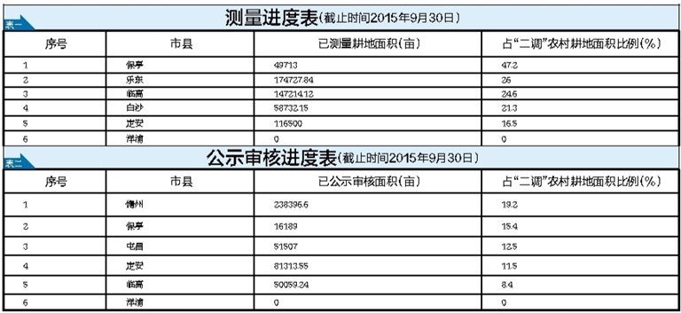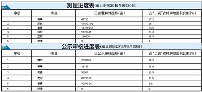 截至今年9月30日,全省各地已开展农村土地承包经营权确权登记颁证工作的乡镇有195个;已测量农村耕地面积为600.66万亩,占国土“二调”农村耕地面积的63%;已公示审核面积345.15万亩,占国土“二调”农村耕地面积36.2%;已颁发经营权证书103447本;档案归档262571卷。其中测量面积占国土“二调”面积比例50%以下的市县是:保亭、乐东、临高、白沙、定安、洋浦(详见表一);公示审核面积占国土“二调”面积比例20%以下的市县是:儋州、保亭、屯昌、定安、临高、洋浦(详见表二)。