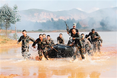 在“携手-2015”中印陆军反恐联合训练极限体能课目训练现场,参训官兵共同完成操舟训练。 从10月13日开始,“携手-2015”中印陆军反恐联合训练进入混编同训阶段,至今,双方在6天的时间内共同进行了十余个反恐课目的训练。