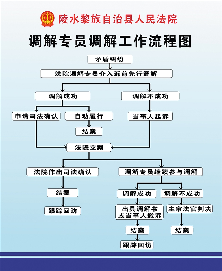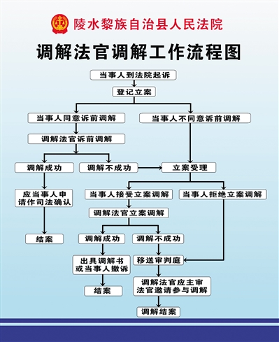 二是试点设立专职调解法官。为有效缓解陵水法院民商事审判工作压力,促使调审适度分离,切实提高审判工作效率,陵水法院打破传统的调解模式,6月份,在院机关立案庭设置专职调解法官。在人员配备方面,人员归口编制在院机关立案庭,由陵水法院党组从有调解工作经验和技巧、且善于使用本地方言的员额内法官中选任了2名专职调解法官负责专职调解工作;在工作管理方面,专职调解法官日常工作由立案庭负责管理,在立案庭设立办公室,制作岗位牌和规范调解工作统计台账、调解工作流程。专职调解法官从接到当事人材料开始,从立案、审理到执行,无论案件进行到何种程度,专职调解法官全程介入案件的调解工作。运行一个多月时间来,2名专职调解法官含应合议庭邀请参与调解在内,已调解结案96件。