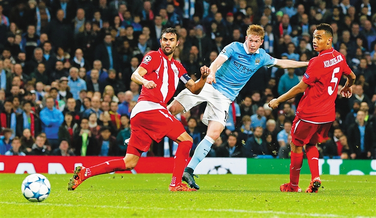 北京时间10月22日,在欧冠联赛D组第三轮比赛中,英超曼城队凭借德布劳内补时阶段的进球,主场以2:1绝杀西甲塞维利亚队。图为曼城队球员德布劳内(中)射门得分。新华社发