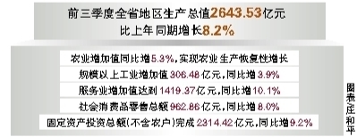 工业方面,我省通过挖掘企业生产潜力推动炼油、医药、电子信息等行业持续快速增长,工业生产保持平稳增长。前三季度规模以上工业增加值306.48亿元,同比增长3.9%。八大支柱产业中,炼油、医药产业保持较快增长,增加值分别增长20.5%和16.5%。