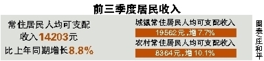 今年前三季度我省常住居民人均可支配收入14203元,比上年同期增长8.8%,扣除价格因素,城乡居民收入增长与经济增长基本实现同步。其中,城镇常住居民人均可支配收入19562元,名义增长7.7%;农村常住居民人均可支配收入8364元,名义增长10.1%。农民收入增长快于城镇居民收入。