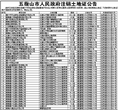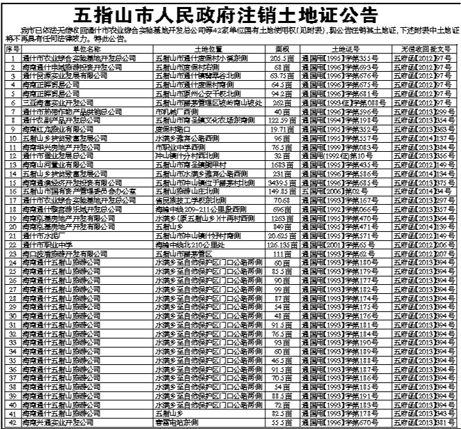 五指山市人民政府注销土地证公告