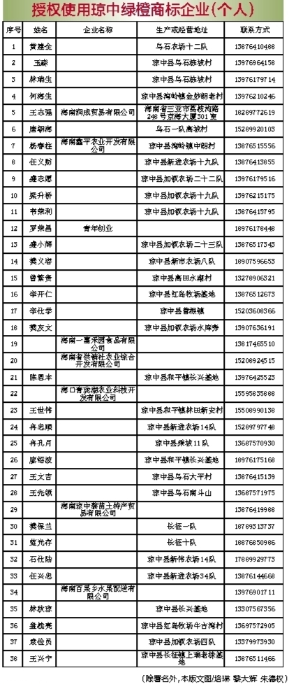 据悉,果农的绿橙送检、抽检,在酸甜度和农药残留等符合标准后,琼中农技中心会给果农免费发送统一印制并贴上二维码标签的琼中绿橙包装箱。截至目前,已有16家公司和果农送检合格,38家签订了商标使用合同。