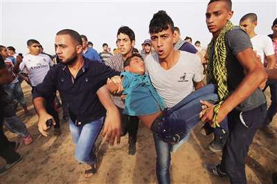 10月23日,在加沙地带的汗尤尼斯,巴勒斯坦示威者在与以军的冲突中转移一名受伤者。 巴勒斯坦示威民众与以色列军队士兵23日在约旦河西岸和加沙地带爆发冲突,造成100多名巴勒斯坦人受伤。 新华社发