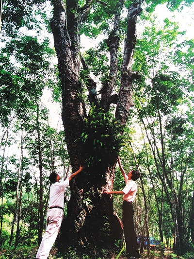 提起琼安胶园,自豪深深写在东太人的脸上。据东太农场场志记载:清光绪三十二年(1906年),乐会县南盈村(今琼海市博鳌镇朝阳墟南盈村)旅居马来西亚的华侨何麟书,在乐会县崇文乡合口湾(今东太农场坡塘区十八队)创办了“琼安胶园”。1954年琼安胶园仍有84亩,存有“祖母树”2006株。1985年大部分“祖母树”被更新,但仍存66株。1993年为把这些珍贵的“活文物”加以保护,东太农场以高研600号高产树2株兑换1株,向何麟书曾孙何子彬兑换保存。