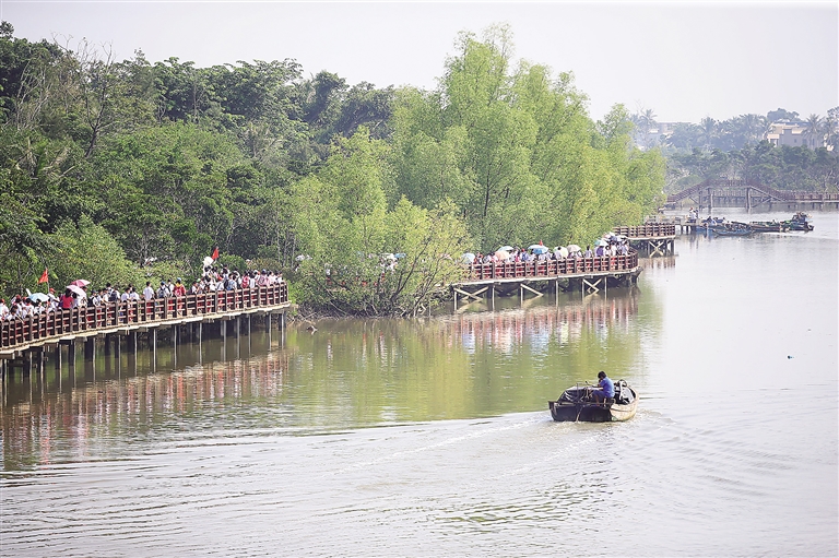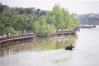十月金秋,在东寨港国家级自然保护区,青翠的红树林随波荡漾,鹭鸟展翅其间,不远处的沼泽波光点点、草芽绿嫩,生机盎然。这是海南岛常见的景,也是海南岛独有的景。