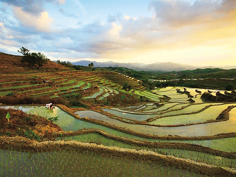 地处五指山市毛阳镇牙胡村的牙胡梯田,现有梯田约1100多亩,梯田呈五指螺纹状,从山脚盘绕到山腰,层层叠叠,高低错落。从高处望去,梯田的优美曲线一条条、一根根,或平行或交叉,蜿蜒如春螺、披岚似云塔,显示出动人心魄的曲线美,被人们誉为“海南第一梯田”。