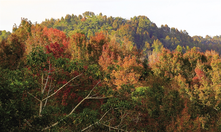 五指山那连绵不断的山峦,层层叠叠的火红枫叶,一点也不逊色于北京香山的红叶,小路旁、溪水边、丛林里、山谷间,那红艳艳、美灿灿的片片纯林,红枫叶傲笑其中,随着欣赏角度的不断变化,枫叶给人的美更为丰富多彩。