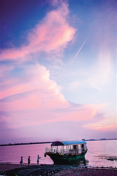 每个黄昏时分,夕阳温柔地倾覆海面,潋滟的波光中,可见赤足的游人走在金黄色的沙滩上,聆听海浪拍打着沙滩。无垠的大海上空,白鸟盘旋。