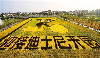 近日,一幅占地面积为12亩的“米老鼠”稻田画现身上海浦东川沙镇一家农场,是当地农民根据策划图案使用彩色稻子种植而成。新华社发