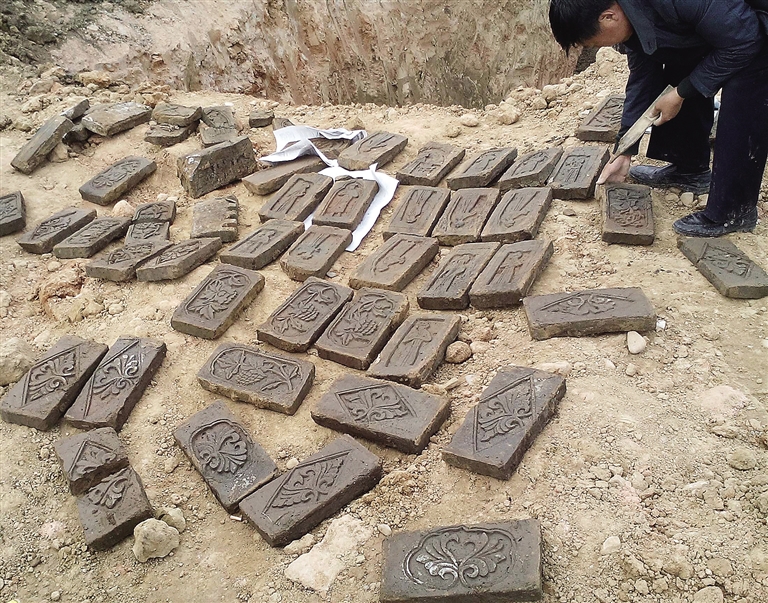 新发现的元代古墓出土了一批花卉纹墓砖。 10月24日下午6时,甘肃临洮至渭源高速公路第五标段施工单位在渭源县祁家庙乡金家坪村花园社施工过程中无意发现一座元代合葬砖室墓。次日,渭源县博物馆进行抢救性挖掘,出土了方形素铜镜、陶罐、瓷碗、侍女图墓室墙砖、花卉纹墓砖等,其中部分器物残破。 新华社发(王纲 摄)