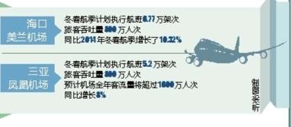 又是一年冬春新航季。对于随着季节的变换温度逐步走低的北方而言,温暖如春的南方充满了吸引力。海南,也随着新航季的到来,迎来了旅游旺季。航空是海南输入游客的主要交通渠道之一,民航2015年冬春航季航班计划已经从10月25日拉开帷幕,海口美兰国际机场和三亚凤凰国际机场两个机场一南一北,将在新航季里为海南这个中国最南端的旅游目的地输送大量游客,也将为出游的海南人搭建更为便利的空中出行通道。