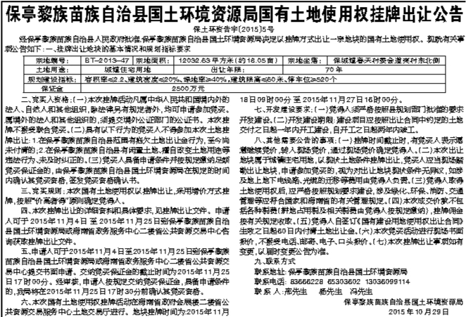 保亭黎族苗族自治县国土环境资源局国有土地使用权挂牌出让公告
