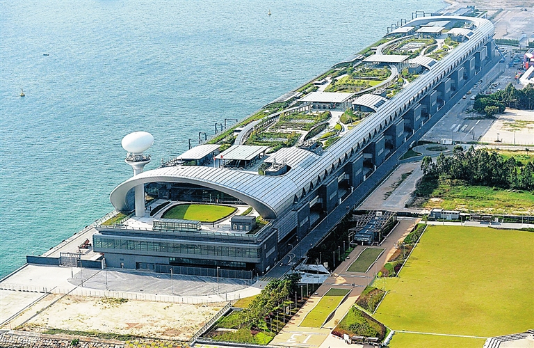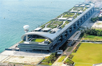 图为香港启德邮轮码头的绿化设施。 香港是太平洋地区降雨量最大的城市之一。为减低水患影响,香港自1989年以来投入240亿港元提升防洪基础建设,水浸黑点已由20多年前的130多个减少至11个。香港共建有3条排水隧道,隧道最大直径超过7米,每秒钟排水量达220多立方米。香港共有18座饮用水库,总容量约5.86亿立方米,可以提供香港居民150天的用水量。绿化设施方面,香港的绿化覆盖率达70%,自2001年开始,政府在可行的情况下在合适的新建政府建筑物工程项目中引入屋顶绿化设计。 新华社发