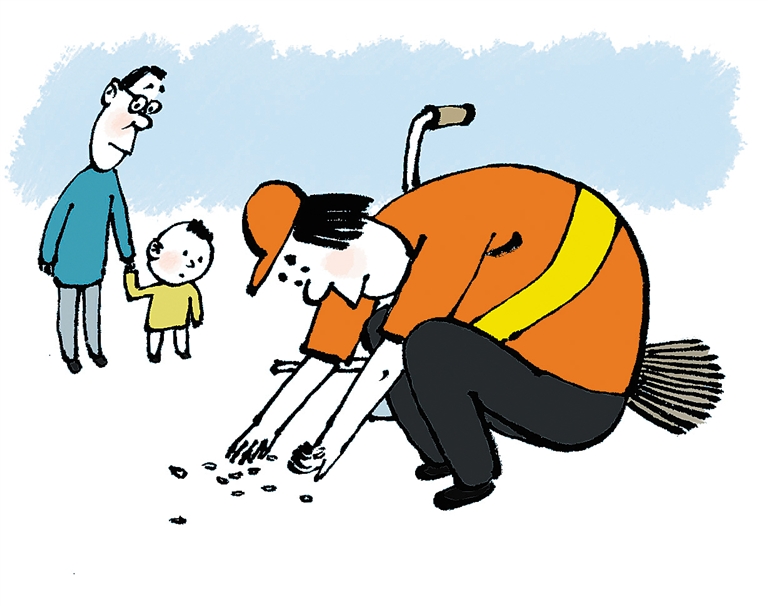 一张再普通不过的工作照,为何能够引起人们的广泛关注?一个再渺小不过的细节,为何让这么多人心灵倍感触动?无他,只是因为那对工作无比深沉的热爱,只是因为身处喧嚣下仍坚守自我的宁静。在我们享受城市的美好时,有人在默默付出;在我们乱扔乱丢时,有人在默默清扫。有些工作虽卑微,但却意义重大,却仍有人在尽心尽职、无怨无悔地坚守,这是怎样的一种感动。环卫工捡起的不仅是瓜子皮,更是职业的尊严,是我们的无地自容。10月的北方已凉意渐显,但这位环卫女工的执着却让人震撼,让人心暖,给人满满的感动。这正是: