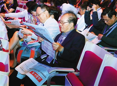 图为与会嘉宾在阅览《海南日报》及为本次大会特别推出的《百年乡团》特刊。
