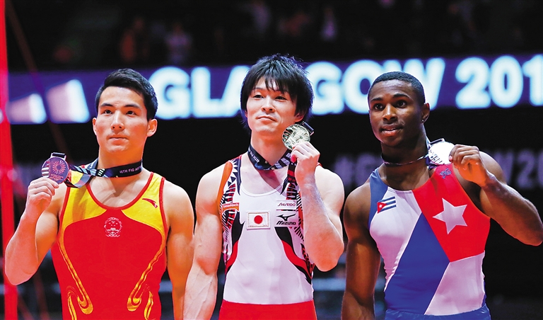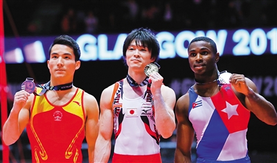 10月30日,在苏格兰格拉斯哥第46届世界体操锦标赛男子个人全能决赛中,日本选手内村航平(中)以92.332分的总成绩获得冠军,赢得史无前例的六连冠。古巴选手拉杜埃特(右)获得亚军;中国选手邓书弟获得季军。 新华社发