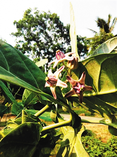 “这种花也叫作牛角瓜,一般生长在海南岛西部沿海沙滩地上,花期很长。”香港嘉道理驻海南保育主任卢刚介绍。据了解,狗仔花,萝藦科牛角瓜属,是热带和亚热带常绿灌木。狗仔花原产印度至中国南方各省,现分布在澳大利亚北部、美洲加勒比海、中美、南美、大洋洲、非洲、印度和以色列等干旱、半干旱地带,一般生长于低海拔向阳山坡、旷野或是海边,果实的形状似牛角,花期、果期几乎是全年。