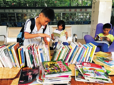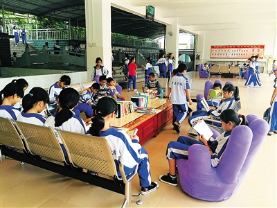 在这个开放的阅读空间旁边,还有两处放了一排排课桌椅的地方,一处是小学阅读区,另一处是中学阅读区,这里,全校每周都会有一个班专门到这里上一堂阅读课。为什么要专门到这里上阅读课?学校校长杨锡平说,这样的安排有两个目的,一是强调阅读的重要性,二是渲染读书的气氛,让学生在充满着书香的氛围中享受阅读。“阅读课有老师指导,比如这段时间建议学生看人物传记类书,一个月有一个读书主题。”
