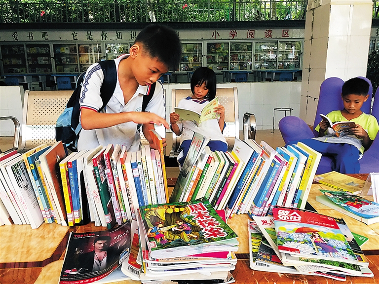 最引人注目的校园中心,一处教学楼的一楼设有开放的“爱心书屋”。这里用休闲的扶手椅子围成了三个阅读空间,每个空间中间的书桌上堆放着书籍,数十个学生正坐在椅子专心地阅读。两边还设有报栏,里面张贴着海南日报、中国教育报等报。阅读空间随时可来读书,这里的书主要来自社会捐赠。不时地有小学生走过来翻看书籍。