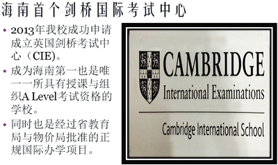 2013年,海南中学成功申请成立英国剑桥考试中心(CIE),成为海南第一也是唯一一所具有授课与组织A Level考试资格的学校,同时也是经过海南省教育厅和物价局批准的正规国际办学项目。
