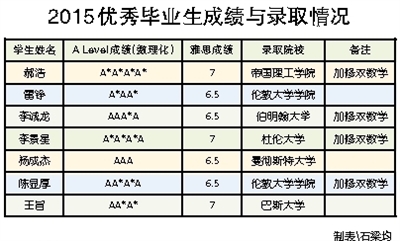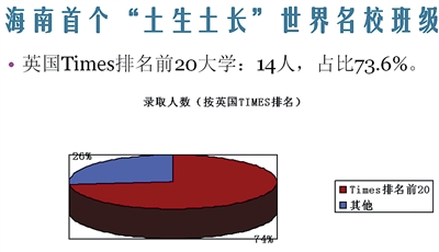 2015年是海中第一届中英班“收官”之年,随着8月国内高考录取工作的结束,在英国进行第3年高中课程学习的海南中学第一届中英班学子也传回捷报。该班19名学生中, 8人被QS世界排名前100的大学录取,占比42%。其中陈显厚、雷铮2位同学被伦敦大学学院录取(UCL,与美国斯坦福大学齐名,QS全球排名第7,英国本国REF排名第5);郝浩同学被帝国理工录取(与美国麻省理工学院齐名,QS全球排名第8,英国本国REF排名第4)。在整体录取的情况中,4名学生的录取院校——伦敦大学学院(7)、帝国理工学院(8)、澳大利亚国立大学(19)世界排名均高于我国清华(25)、北大(41)的世界排名。除此之外,全班19名同学,有14人被英国Times排名前20的大学所录取,占到全班总人数的74%。
