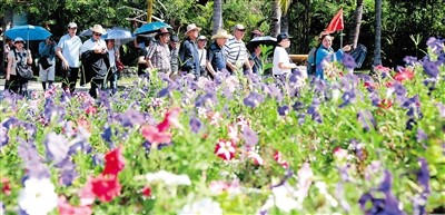 10月30日,一个来自台湾的“夕阳红”中老年旅游团在三亚南山景区游览。