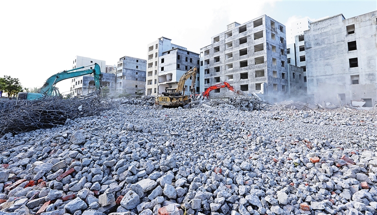 自今年8月8日提前四个半月完成该项目征收签约工作后,流水坡片区棚改指挥部全力实施房屋腾空和拆除工作,截至目前,已拆除房屋面积约45%,预计11月底完成该项目的拆除任务。图为海口市滨江路流水坡棚户区改造项目拆迁现场。