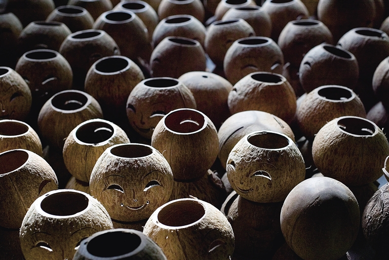 谈及椰子饰品用品,当然离不开椰雕。椰雕是海南岛的特产之一,是海南雕刻艺人利用椰子雕制的工艺品。在海南,椰雕历史渊源悠久,用椰子壳、椰棕、椰树木等材料进行艺术加工,如今已有300年的悠久历史。