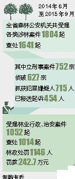 根据省森林公安局提供的数据资料显示,从2014年6月至2015年9月,全省森林公安机关共受理各类涉林案件1804起,查处1641起。其中立刑事案件752宗,侦破627宗,抓获犯罪嫌疑人715人,已移送起诉454人。受理林业行政、治安案件1052起,查处1014起,林政处罚1146人,罚款242.7万元。