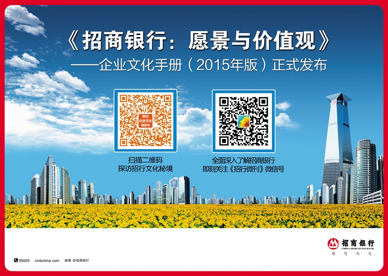 此次推出的新版企业文化手册共计15935字,编撰历时半年,先后经历了10余次大幅度修改,最终通过纸质版、PDF版和微信版三个主要渠道进行发布推广。在内容上,分别从招行的历史、愿景、目标、价值观、战略、员工这六个维度,系统阐述了三大问题:第一,招行从哪里来?第二,招行将走向何方?第三,作为团队中不可或缺的一员,该如何携手共进?新版手册确定了招行的愿景,即通过持续的服务升级,成为目标客户的首选银行,成为具有国际竞争力、中国最受尊敬的商业银行。通过认真总结28年来招行人身上所特有的精神,梳理出八条价值观:“因您而变”是招行的服务追求;创新是招行存在的最大理由;稳健经营是招行与生俱来的DNA;合规是企业和员工成长的基石;让员工做自己的主人;最值得尊敬的是专家;追求卓越是招行人的特质;化繁为简,严谨高效。正是对这些核心价值观的认同、践行与传承,招商银行在28年间实现了在市场竞争中的无数第一,成就了市场认同、客户满意的服务金字招牌,完成了从蛇口走向世界的飞跃式发展,创造了世人瞩目的“招银模式”。