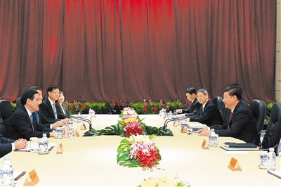 下午3时,新加坡香格里拉大酒店会见大厅。身着深色西服,分别系着红色、蓝色领带的两岸领导人习近平、马英九,从大厅两侧同时走出,相向而行。在黄色幕布中央前方,他们将手伸向对方,紧紧握在一起。