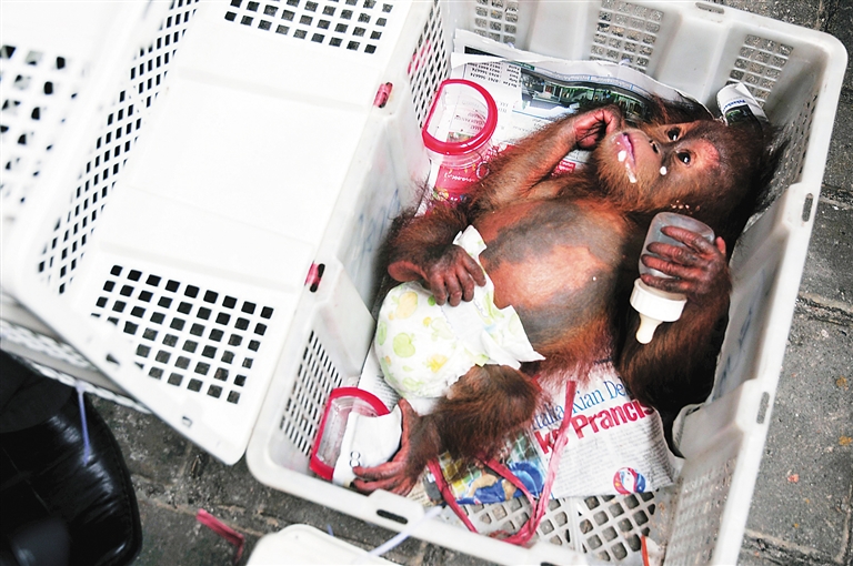印度尼西亚廖内省北干巴鲁警方从野生动物走私集团查获的猩猩幼仔。 据印尼当地媒体报道,警方调查人员抓获了数名野生动物走私团伙成员,解救了3只猩猩幼仔。这3只猩猩幼仔的年龄在6个月至12个月之间,它们被从亚齐的森林中盗猎后,以每只2500万印尼卢比(约合12500元人民币)的价格卖给在北干巴鲁的买家。 新华社/路透