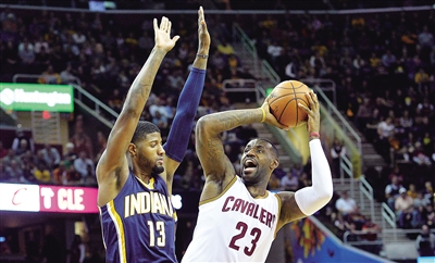 图为骑士队球员勒布朗·詹姆斯(右)在比赛中面对步行者队球员保罗·乔治的防守下投篮。 新华社发