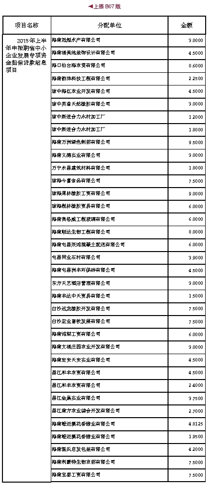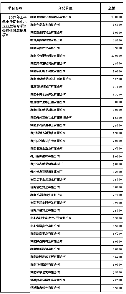 ~~~海南省中小企业发展专项资金分配表 单位: 万元