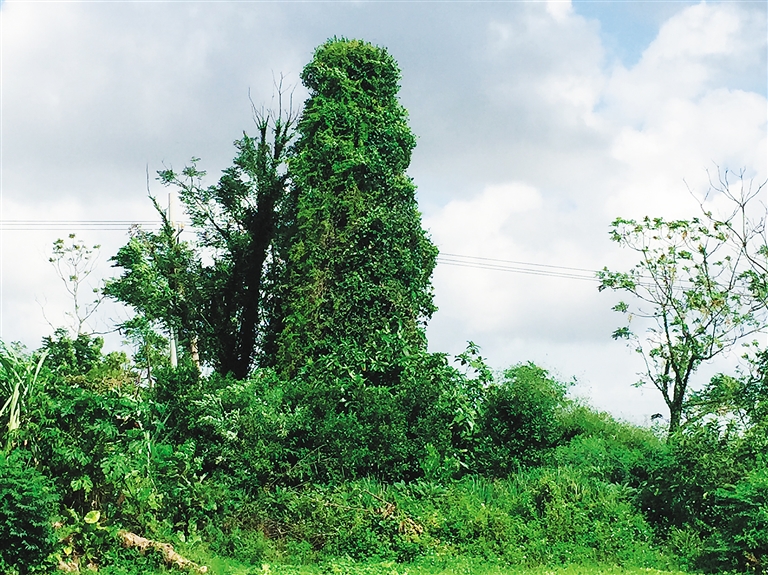 记者站在村口一条水泥路旁向田间远远望去,只见田间矗立着一座被绿色蔓藤完全覆盖的凸起物,宛如一棵大树,“树身”已严重向南倾斜大约30度。一旁的村民提醒记者:那棵倾斜的“大树”就是起云塔!