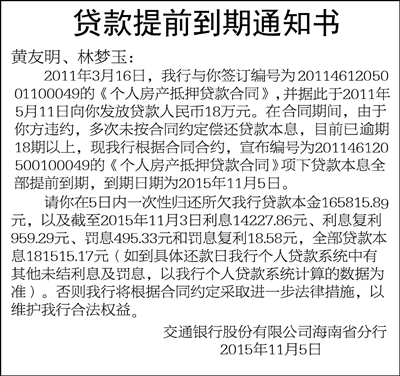 贷款提前到期通知书
