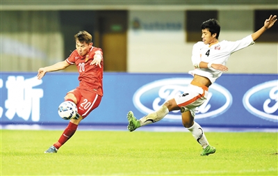 11月12日,在俄罗斯世界杯亚洲区预选赛中,中国队主场12:0胜不丹队,本场比赛在长沙贺龙体育中心举行。图为中国队球员于汉超(左)在比赛中射门。 新华社发