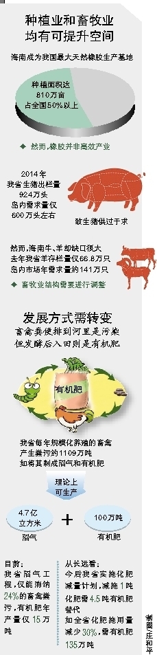我省畜牧业结构也需要进行调整。数据显示,2014年我省生猪出栏量达924万头,然而岛内市场需求量仅为600万头左右,导致生猪供过于求,由于养殖成本高于外省,运输岛外不具备价格优势。然而,海南牛、羊却缺口很大,去年我省羊存栏量仅为66.8万只,而岛内市场年需求量约141万只。