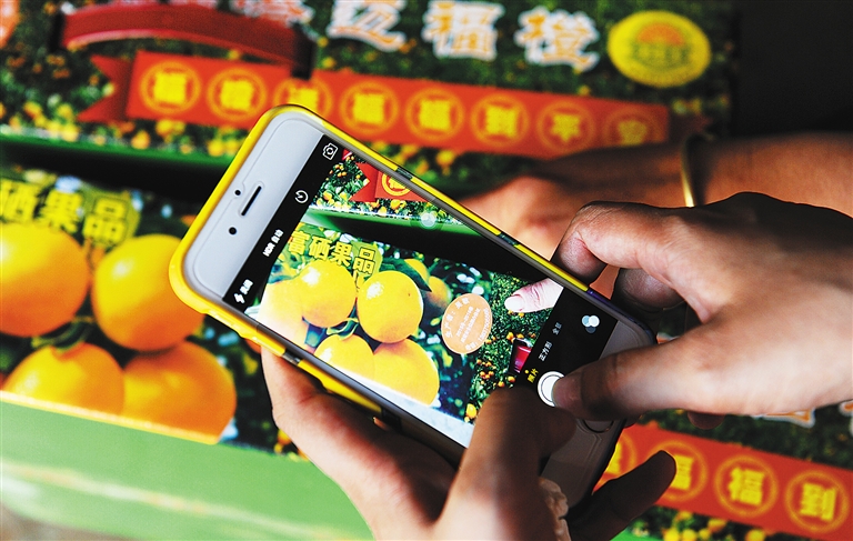 11月11日,澄迈县福山镇福橙种植户吴敬的妻子正在拍摄刚刚采摘下来的橙子。她将经过县农技中心检测合格的橙子整齐地装入印有统一的国家地理标志的纸箱。她不但要给每一个橙子贴上合格证,而且要给包装箱贴上“种植户吴敬+电话号码”的标签。